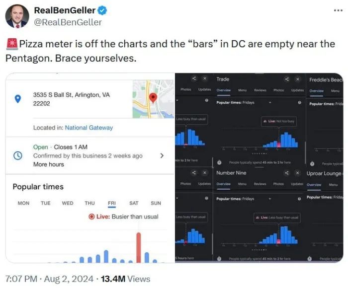 就在8月初中东大规模战争一触即发之际,美国纽约州前州议员Ben Geller在社交媒体平台X发布消息,称华盛顿“披萨晴雨表”出现异常,五角大楼附近酒吧异常空闲,表明美国在谋划军事行动。拜登政府的紧张程度可见一般。